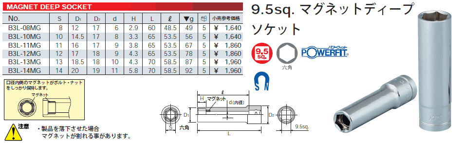 [KTC-B3L-08MG] 3/8sq マグネットディープソケット 8mm