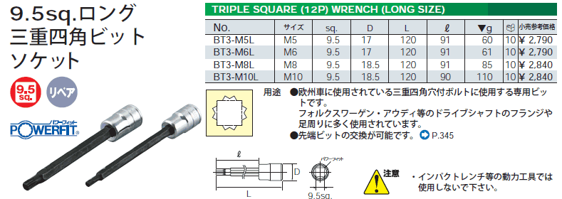 [KTC-BT3-M6L] 3/8sq ロングトリプルスクェアソケット M6