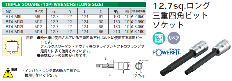 [KTC-BT4-M8L] 1/2sq ロングトリプルスクェアソケット M8
