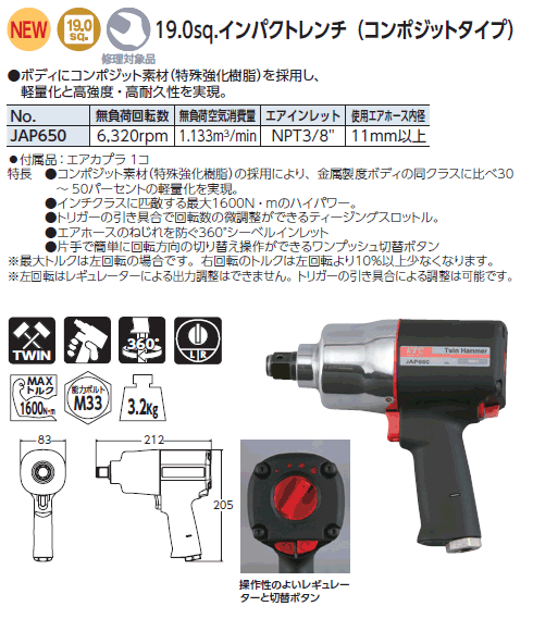 特殊強化樹脂ボディを採用した軽量ハイパワーエアインパクトレンチです。