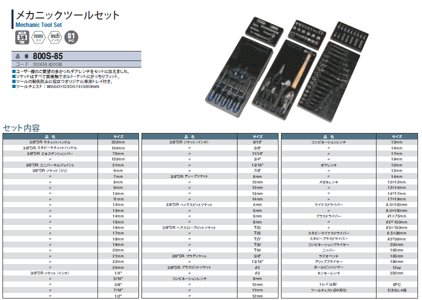 [SIGNET-800S-85] 工具セット [81点] (3/8sq) (ミリ)(インチ)