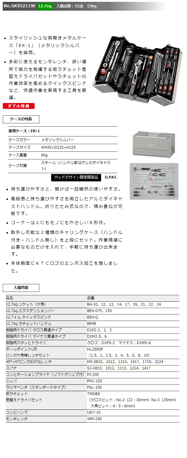 [KTC-SK45211W] 工具セット [52点] (1/2sq) メタリックシルバー