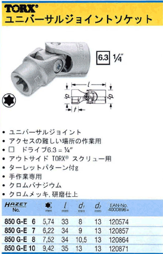 [HAZET-850G-E8] 1/4sq ユニバーサルトルクスソケット E8