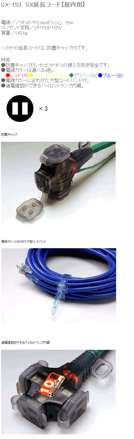 [HATAYA-SX-153-B] 延長コード 屋内用 15m (ブルー)