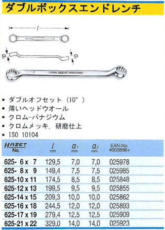 [HAZET-625-10×11] 10゜メガネレンチ 10×11mm