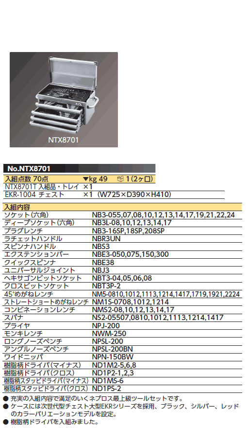 [nepros-NTX8701] ネプロスツールセット [70点] (3/8sq)(シルバー)