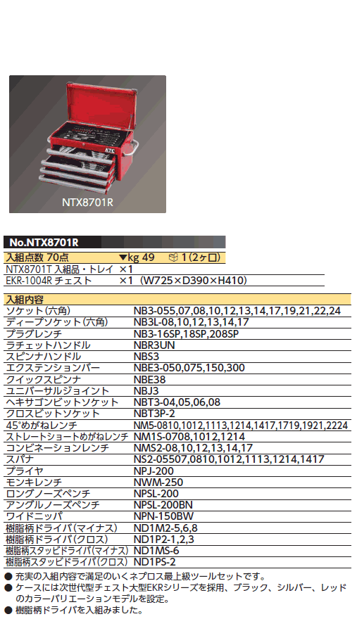 [nepros-NTX8701R] ネプロスツールセット [70点] (3/8sq)(レッド)